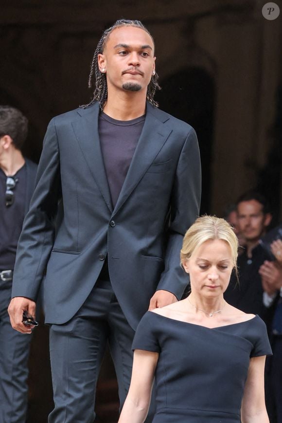 Audrey Crespo-Mara et son fils Sékou – Sorties des obsèques de Thierry Ardisson en l’église Saint-Roch de Paris, France, le 17 juillet 2025. © Clovis-Jacovides/Bestimage