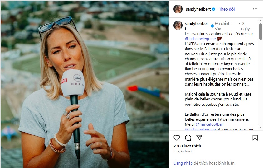 Un choix dicté par l’UEFA, comme nous l’apprend l’ancienne présentatrice franco-britannique Sandy Herbiert, sur son compte Instagram : « L’UEFA a eu envie d’un changement après 6 ans sur le Ballon d’or : tester un nouveau duo juste pour le plaisir de changer, sans autre raison que celle-là. » Si elle salue « une des plus belles expériences TV » de sa carrière, Sandy Heribert reste amère sur la manière de faire…