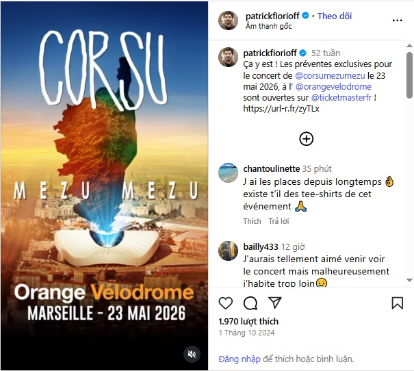 Patrick Fiori et sa bande vous donnent donc rendez-vous au Vélodrome le 23 mai 2026, pour célébrer “Corsu Mezu Mezu 3″ en live !