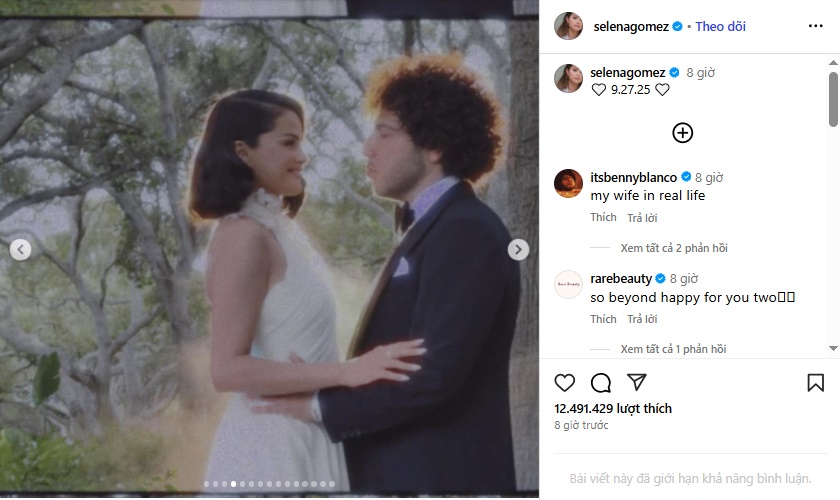 Les fans attendaient depuis un moment l’annonce de l’heureuse nouvelle, elle est enfin tombée. Selena Gomez a publié sur Instagram un carrousel de clichés et de vidéos de son union avec le producteur musical à succès Benny Blanco – de son vrai nom Benjamin Joseph Levin -. Selena y est époustouflante en robe de mariée Ralph Lauren, au côté d’un Benny en smoking, presque intimidé par la beauté de son épouse. La publication était accompagnée d’une légende portant simplement la date de leur union 27.09.25 entre deux cœurs blancs. L’heureux époux a commenté : “ma femme dans la vraie vie”.